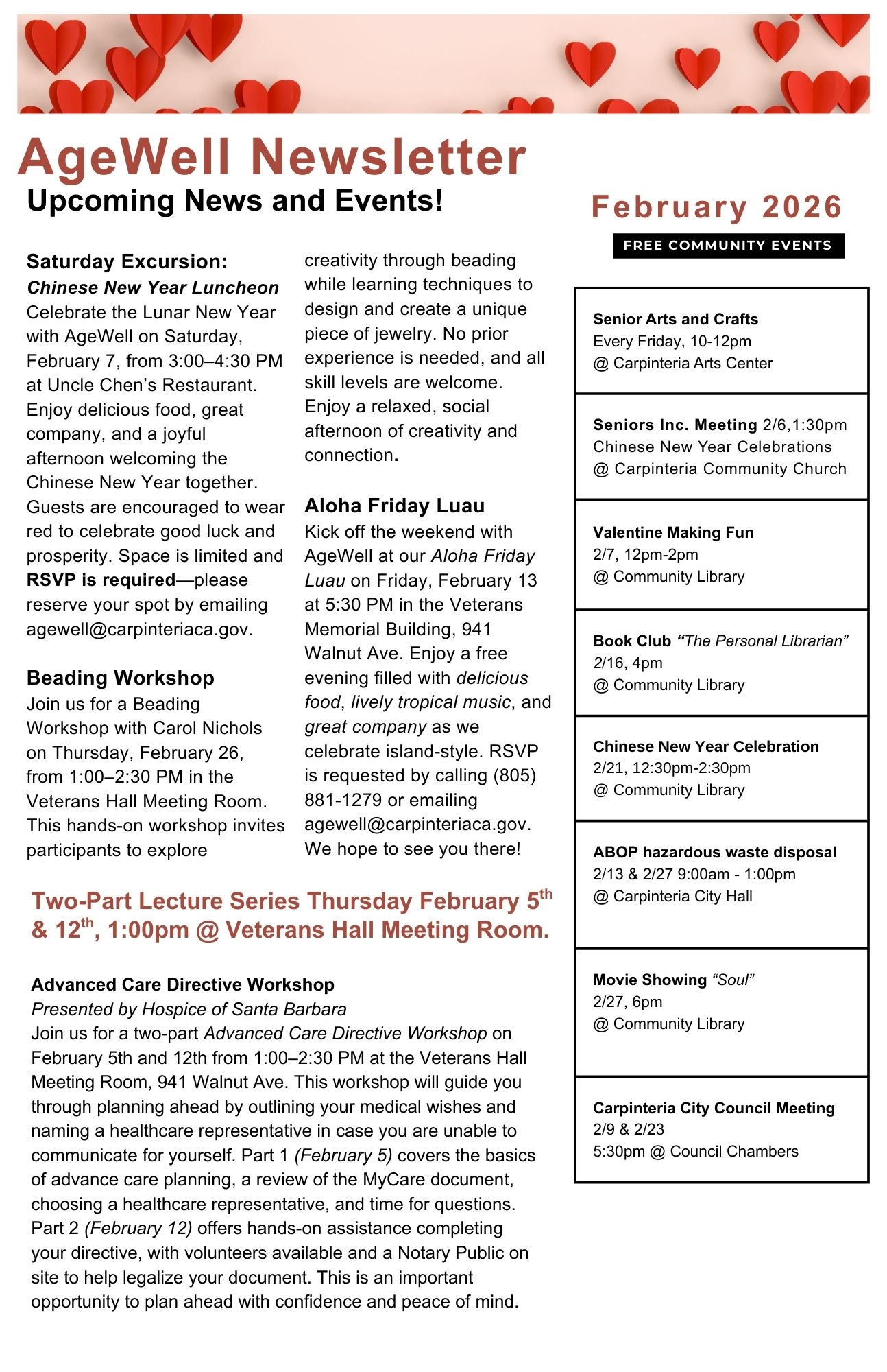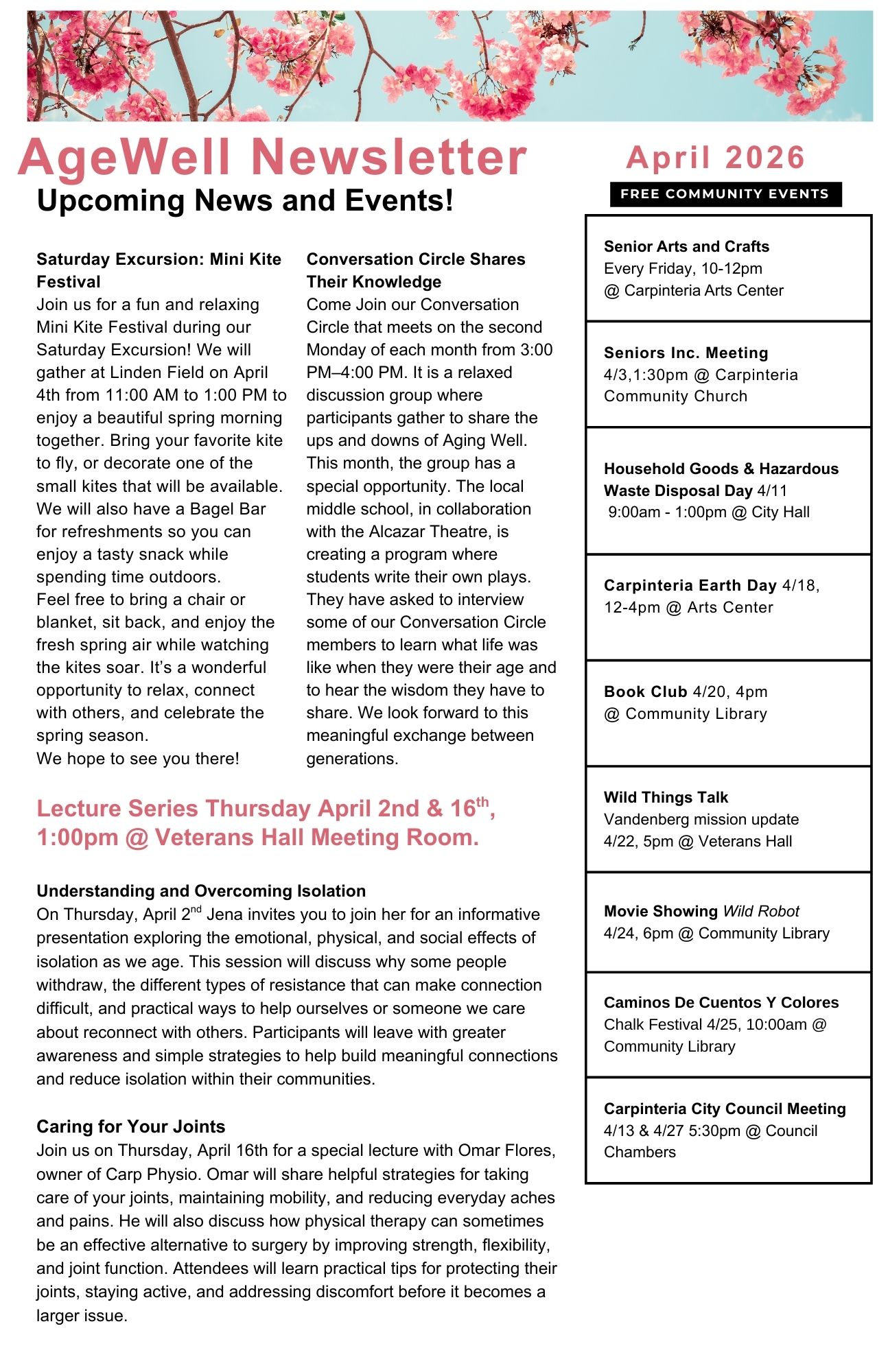 Newsletter AgeWell Newsletter Carpinteria Programs and Services Become a Member Learn new skills, make friends, attend special events and stay healthy with a AgeWell membership. Learn More Calendar of Events Take a look at the wide variety of AgeWell events going on this month in the City of Carpinteria. Learn More Lunch Time Café Lunch time Café provides hot meals in a social setting to anyone 60 years of age or older Free of cost. Learn More Volunteer Volunteer for our rewarding AgeWell programming, simply click the button below for the application. Learn More Newsletter Read the latest scuttlebutt from the City of Carpinteria AgeWell programming including special events. Learn More