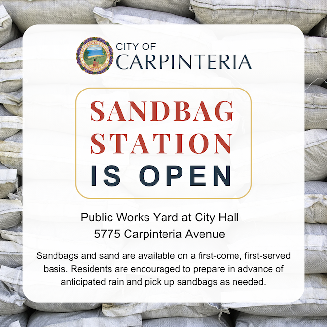 Prepare ahead of the incoming storm. A fill-as-you-go sandbag station is available at the Public Works Yard at City Hall (5775 Carpinteria Ave).