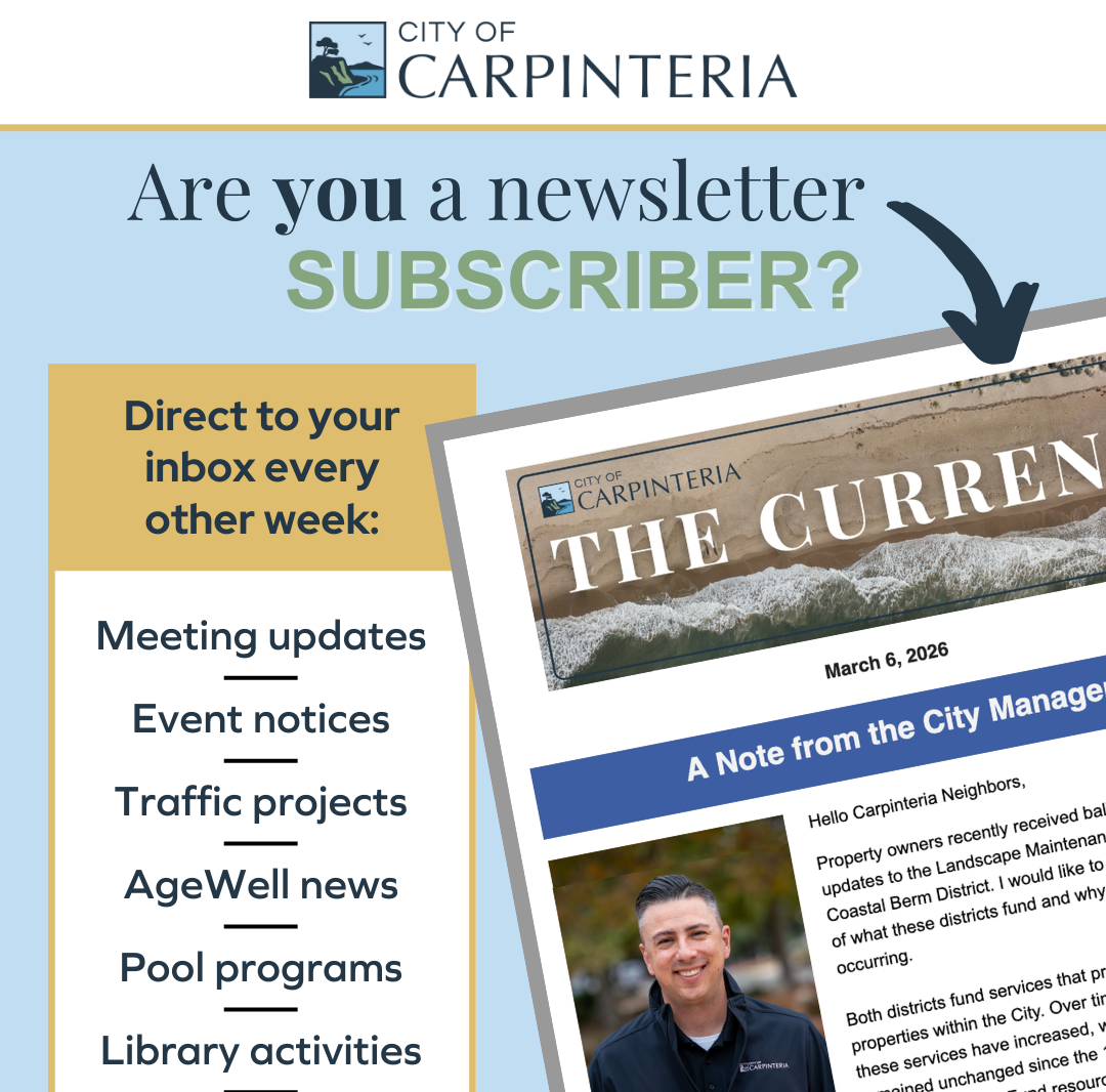 There’s a brand new edition of The Current in inboxes today! If you are interested in staying up to date on City news, sign up to receive this twice monthly City of Carpinteria newsletter.